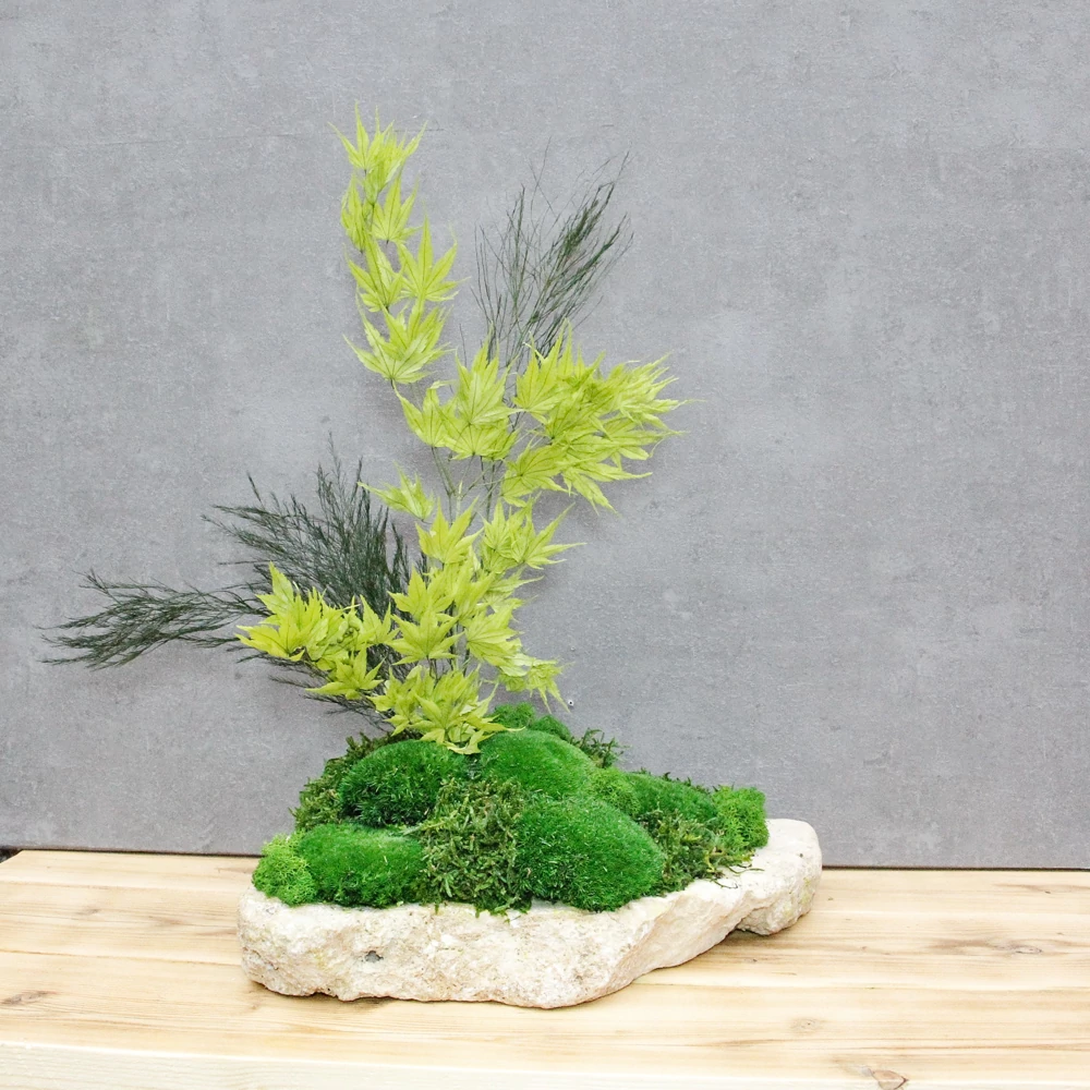 A mészkő minden darabja egyedi formájú és rajzolatú — az eltérő szín árnyalatoktól, a természetes repedésekig minden részlete az idő rétegeit őrzi. Ezen a szilárd, ősi felületen kel életre a gondosan felépített tartósított növénydekoráció: